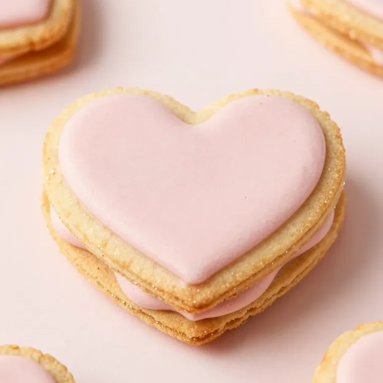 A close-up of a heart-shaped cookie sandwich with smooth pink icing, set against a soft, diffused light that highlights the glossy finish and creates gentle shadows, with a shallow depth of field and a blurred light pink background.