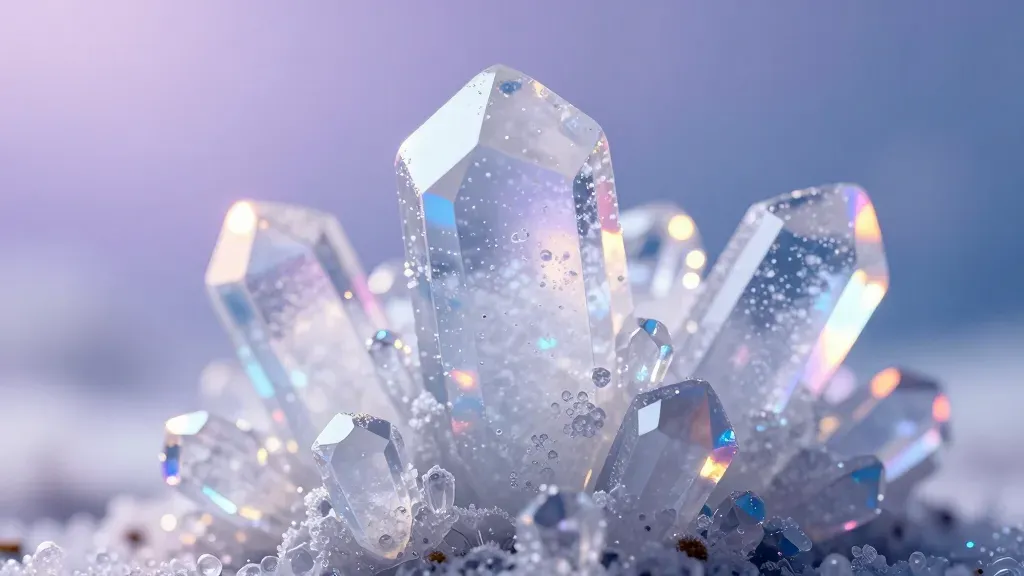Close-up of iridescent ice crystals with trapped air bubbles, glowing softly in a cool blue and purple gradient, creating a mesmerizing, frosty ambiance. The shallow depth of field blurs the background, emphasizing the intricate details and vibrant colors of the crystals.