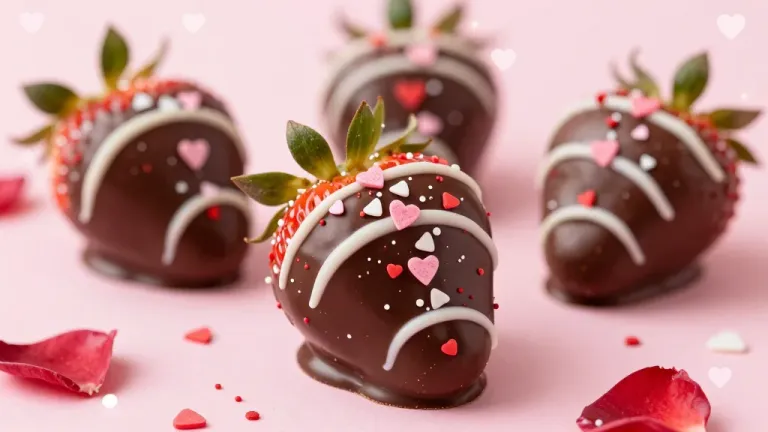 Glossy dark chocolate-coated strawberries with white drizzle and tiny pink heart sprinkles, arranged in a shallow cluster with fresh green leaves. Soft diffused lighting and shallow depth of field create a romantic mood with a clean, pastel pink background and scattered rose petals.