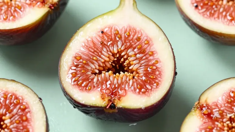 A close-up of a sliced fig reveals its juicy interior with vibrant red flesh and golden seeds, set against a soft, diffused light that highlights the texture and color, creating a visually appealing and detailed shot.