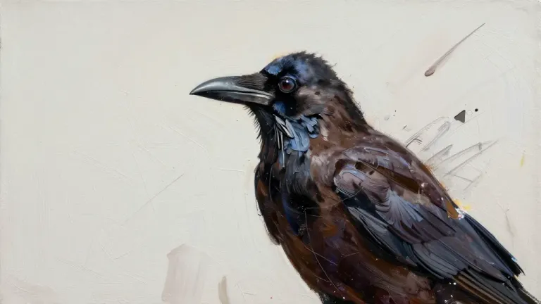 A raven perched with glossy black feathers, softly lit to highlight its texture and beak, against a pale, textured background that contrasts with its dark plumage. The composition focuses on the raven, with the background slightly blurred to emphasize the subject.