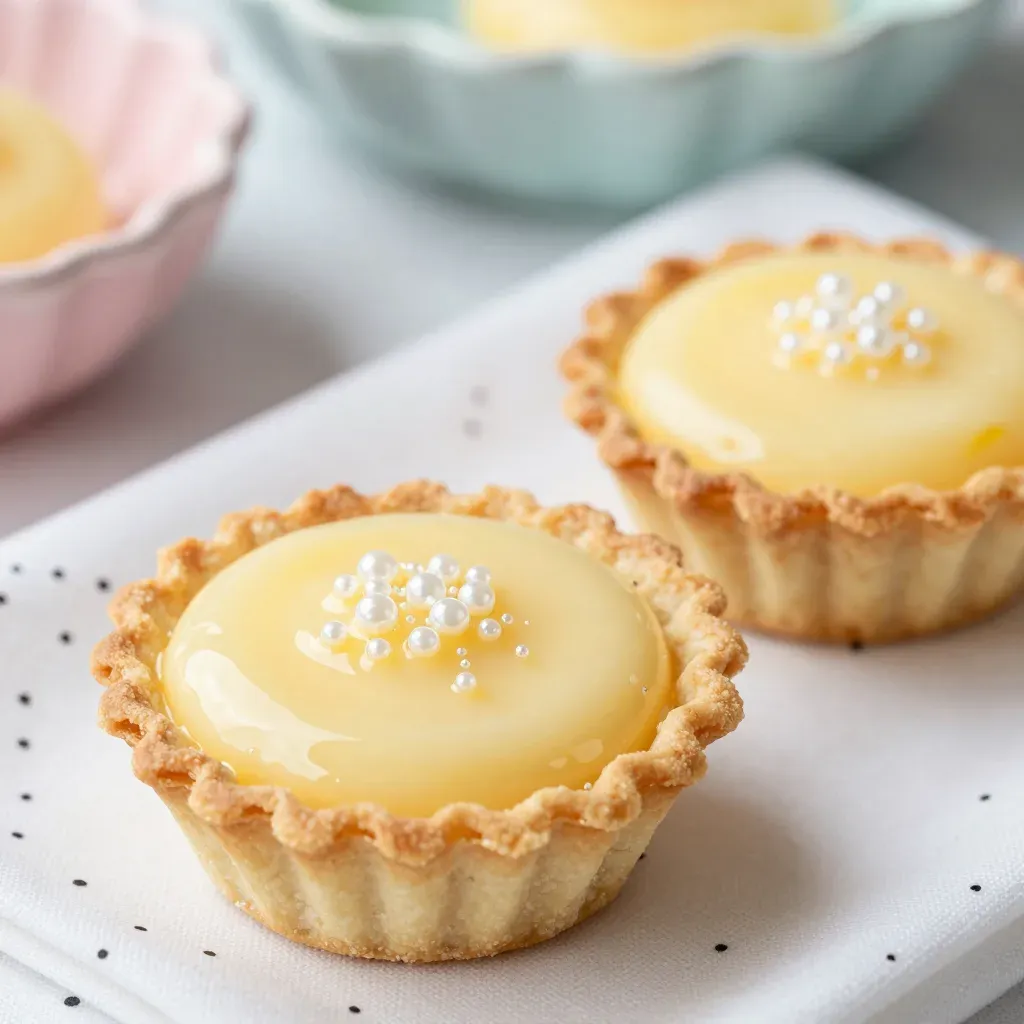 Golden-brown tartlets with glossy lemon curd and delicate white sprinkles, softly lit to highlight texture and depth, set against a clean, minimalist background with out-of-focus bowls.