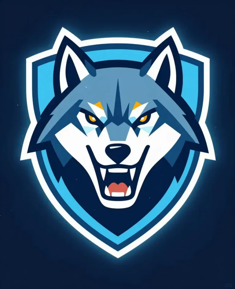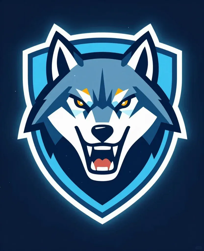 A glossy, reflective wolf's head with glowing edges, set against a dark background, creating a powerful and cold visual. The symmetrical composition and directional lighting emphasize the wolf's fierce expression and the insignia's glowing effect.