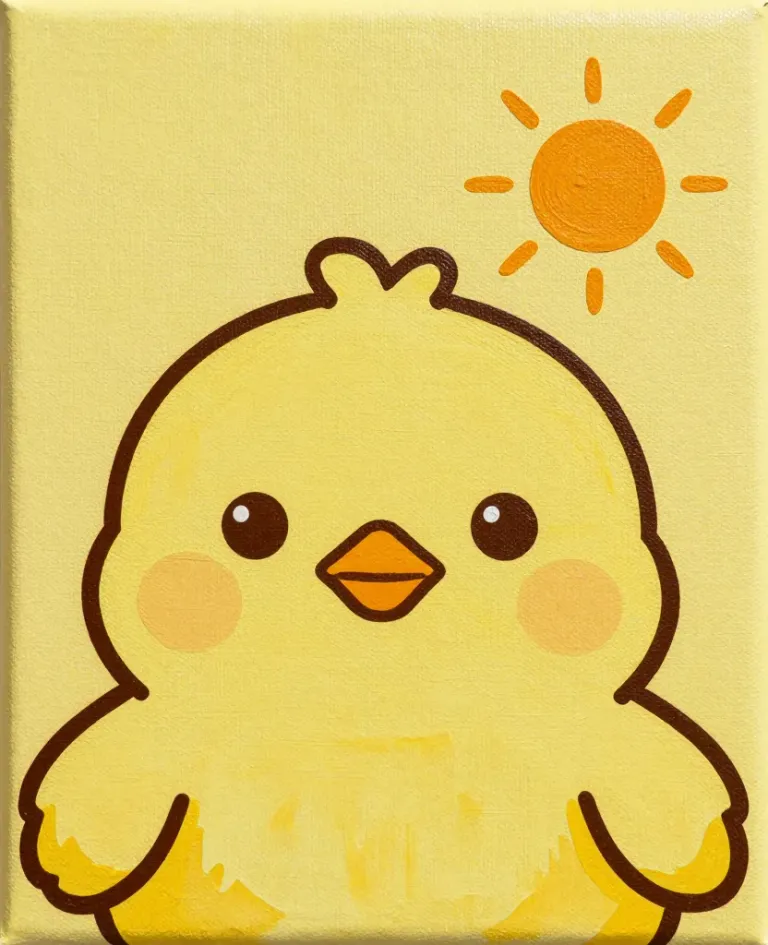A soft, glossy yellow chick with a round head and fluffy body is bathed in warm, golden sunlight, creating a serene and inviting atmosphere. The minimalistic, slightly blurred background enhances the focus on the chick, making it perfect for use in children's or nature-themed designs.