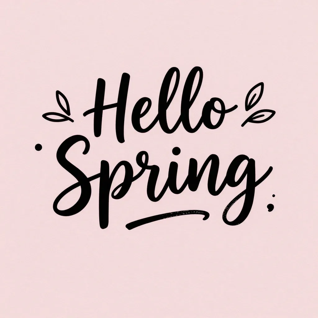 A centered, symmetrical 'Hello Spring' lettering with green leaf illustrations on a soft pink background. The diffused, even lighting highlights the smooth, glossy paper texture, creating a clean and minimalistic aesthetic.