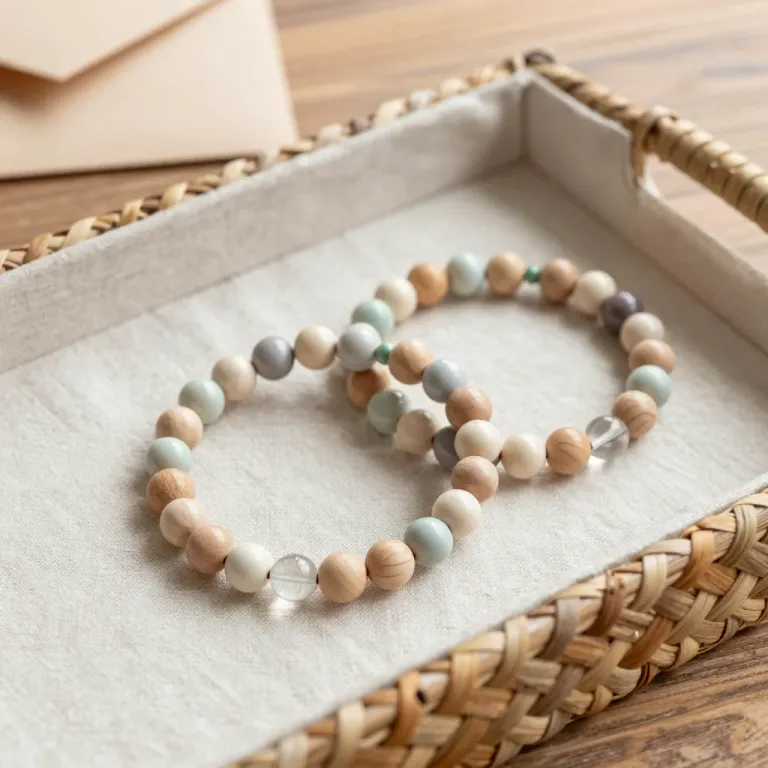 Three handcrafted wooden beaded bracelets with clear crystal accents rest on a soft linen-lined woven rattan tray, showcasing natural wood tones and subtle earthy hues. Soft natural light from the upper left creates gentle highlights on the beads and crystal, with shallow depth of field emphasizing the bracelets against a blurred wooden surface and beige envelope in the background.