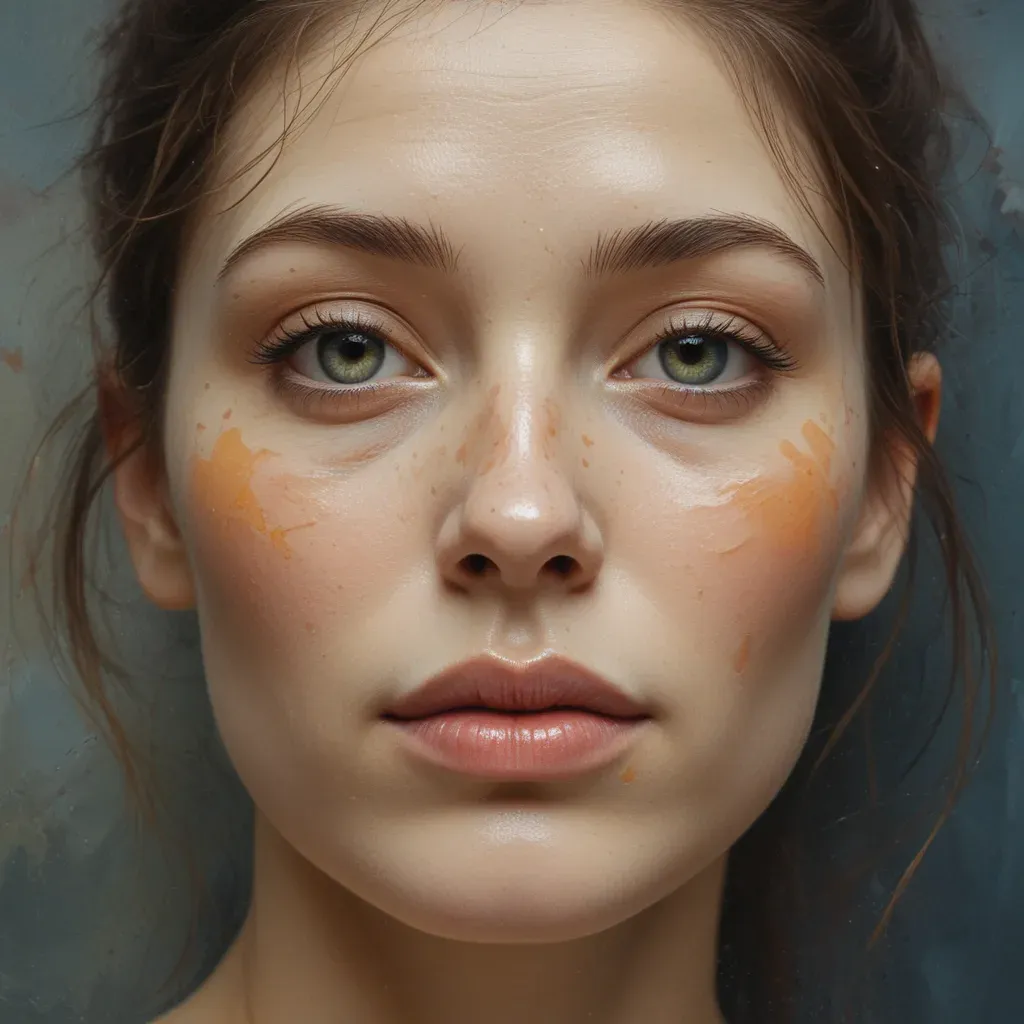 A close-up of a person's face with smooth, slightly glossy skin and a natural sheen, illuminated by soft, diffused lighting that creates gentle highlights on the nose and cheeks. The blurred, out-of-focus background provides a neutral backdrop, emphasizing the subject's facial features and creating a shallow depth of field.