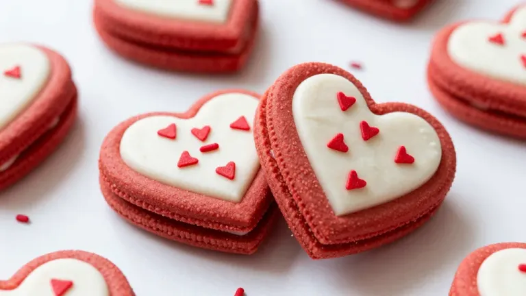 Soft, crumbly heart-shaped sandwich cookies with glossy white icing and vibrant red filling, softly lit to highlight the glossy sheen and casting gentle shadows, with a blurred background ensuring focus on the intricate details.