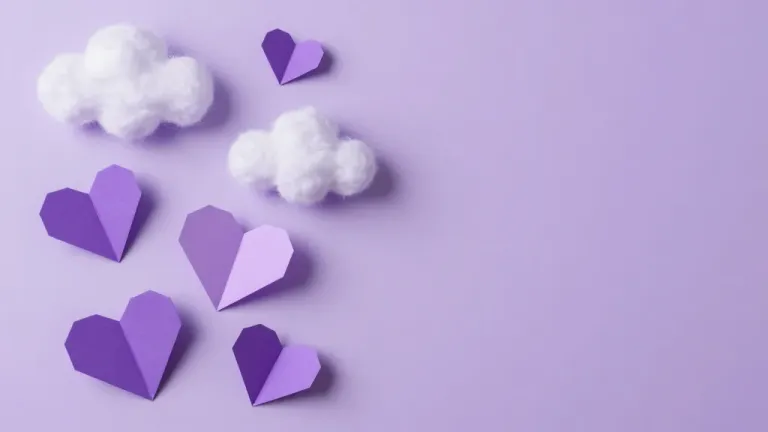 Glossy paper hearts and fluffy cotton clouds are scattered against a soft lavender background, creating a serene and whimsical scene. The diffused lighting highlights the textures and shapes, offering ample copy space for various design applications.