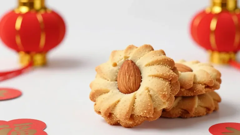 A close-up of a star-shaped almond cookie with a sugary surface and soft almond interior, highlighted by soft, diffused lighting. The shallow depth of field and blurred background with red lanterns and Chinese characters create a festive and elegant setting.