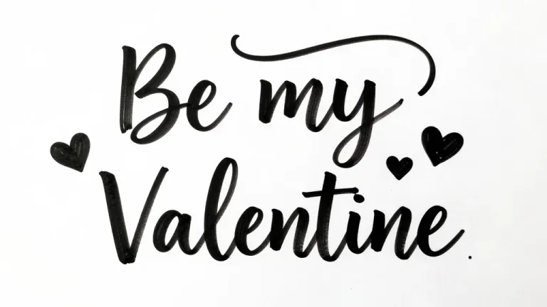 A glossy, black text phrase 'Be my Valentine' surrounded by hearts, set against a clean white background. The even lighting and centered composition create a balanced and harmonious layout, ideal for Valentine's Day greetings or romantic designs.