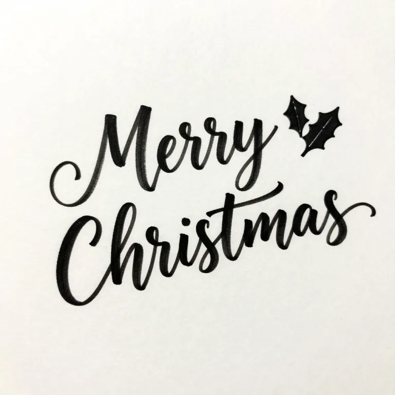 A hand-drawn 'Merry Christmas' script in black ink on a smooth, glossy white paper, enhanced by soft, diffused lighting that highlights the ink's glossy finish. The clean, white background emphasizes the elegant script and subtle holly leaf detail, making it ideal for holiday greetings and invitations.