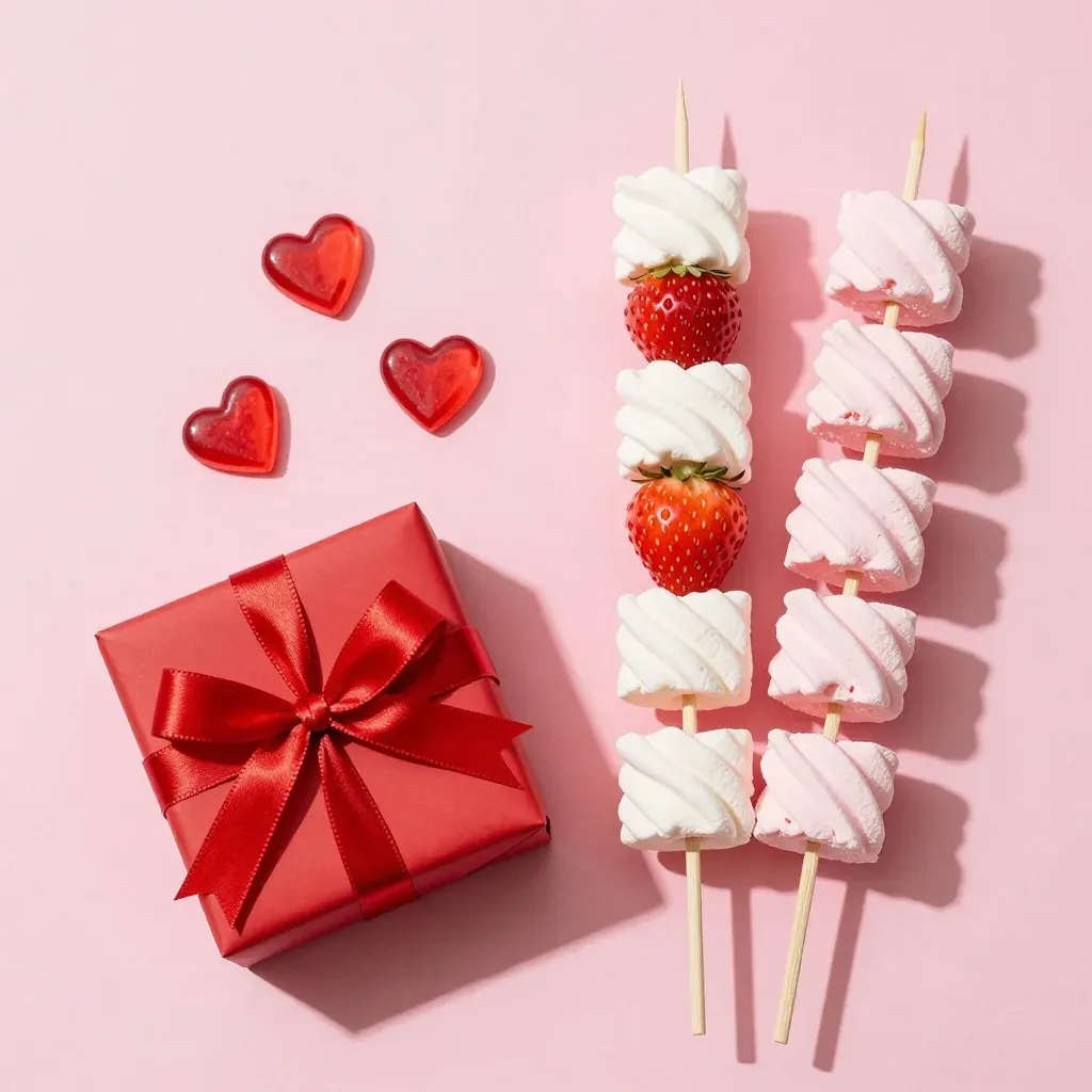 Glossy red gift box with ribbon sits beside skewers of strawberries and fluffy white marshmallows, set against a soft pink background with scattered glossy red hearts. The diffused lighting highlights the textures and creates a balanced, visually appealing scene with ample copy space.