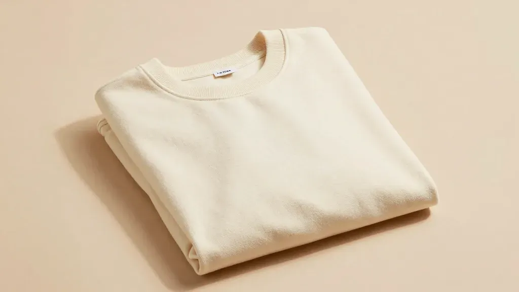 A neatly folded cream-colored crewneck sweater with a soft, textured fabric, illuminated by diffused, warm light that creates subtle shadows and highlights. The neutral beige background, blurred to emphasize the sweater, offers ample copy space for design integration.