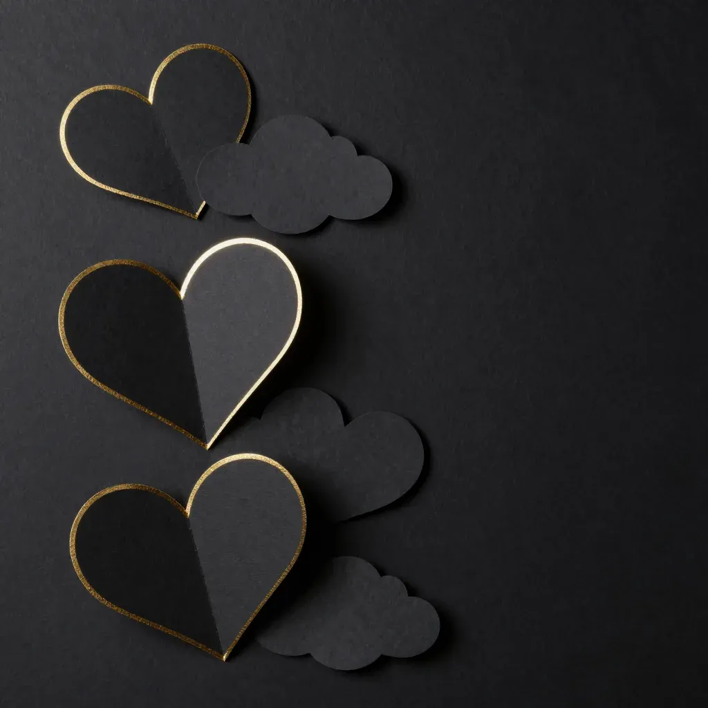 Glossy black hearts and clouds with gold foil edges are arranged asymmetrically against a dark, uniform background, creating a soft, diffused light effect that highlights the subjects. The composition offers ample copy space for design integration.