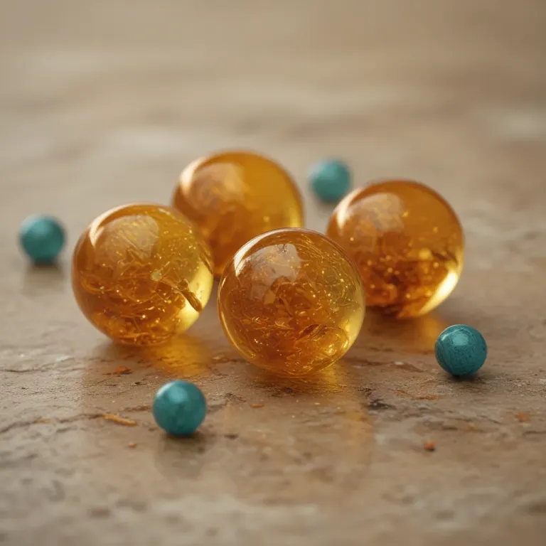 Translucent amber-gold spheres with a glossy finish and subtle roughness, softly lit to create gentle shadows and highlights, set against a blurred earthy background that emphasizes the spheres' texture and color contrast.