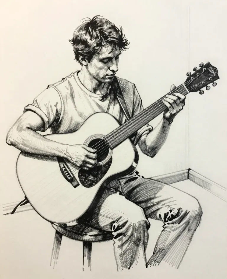 A young man is deeply focused on playing an acoustic guitar, with soft, diffused lighting highlighting his hands and the guitar's glossy strings. The simple white background, blurred and out of focus, emphasizes the subject and creates a clean, minimalist composition.