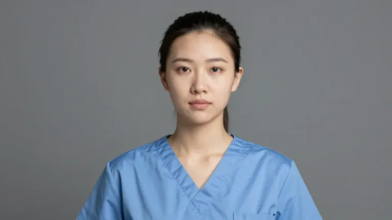 A serene nurse in a light blue uniform, her hair neatly tied back, stands against a neutral gray background. Soft, diffused lighting highlights the smooth texture of her uniform, creating a professional and calming atmosphere.