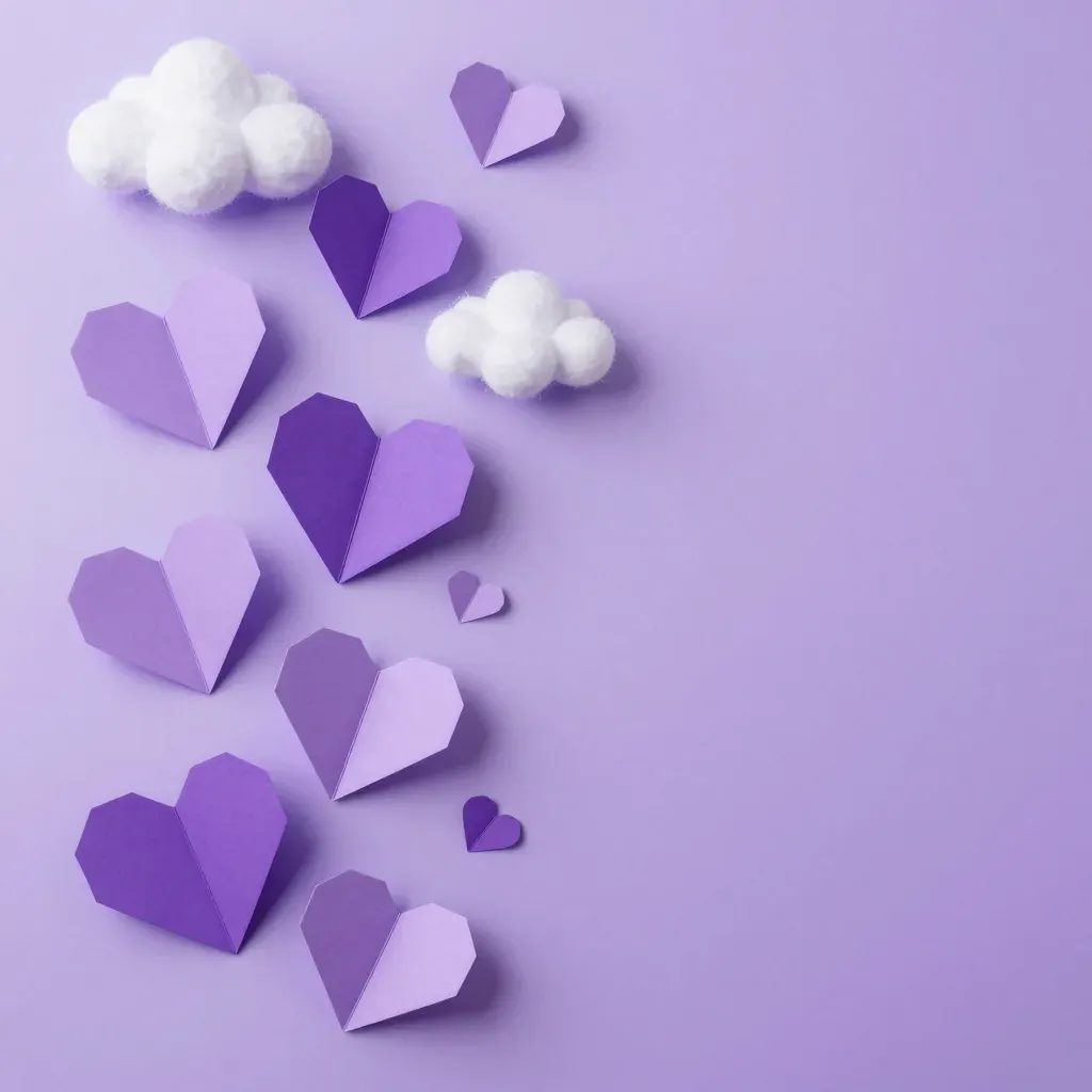 Softly lit origami hearts and fluffy cotton clouds create a serene, dreamy atmosphere against a solid lavender background. The gentle shadows and balanced composition make this image perfect for romantic and calming designs.