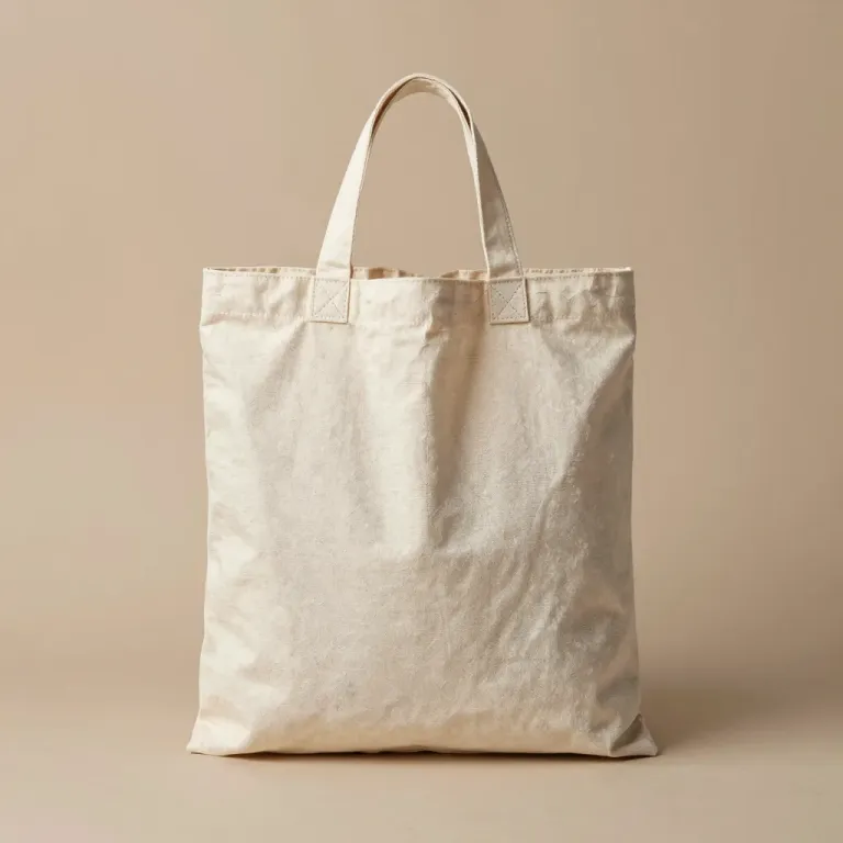 A soft, slightly textured canvas tote bag folded and displayed against a neutral beige background, with diffused, soft lighting highlighting its folds and creases. The clean, unobtrusive backdrop provides ample copy space for design purposes.