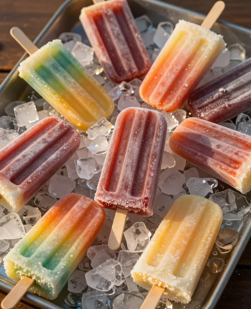 #Homemade#Popsicles#Wooden Sticks#Golden Hour#Ice Cream#Crushed Ice#Warm Lighting#Circular Arrangement#Dark Background#Food Photography