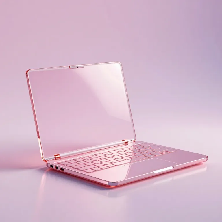 A sleek, transparent glass laptop with a glossy finish and soft, diffused lighting highlights its smooth texture and translucency. The shallow depth of field and pastel pink gradient background create a clean and minimalistic aesthetic, ideal for modern, tech-focused designs.