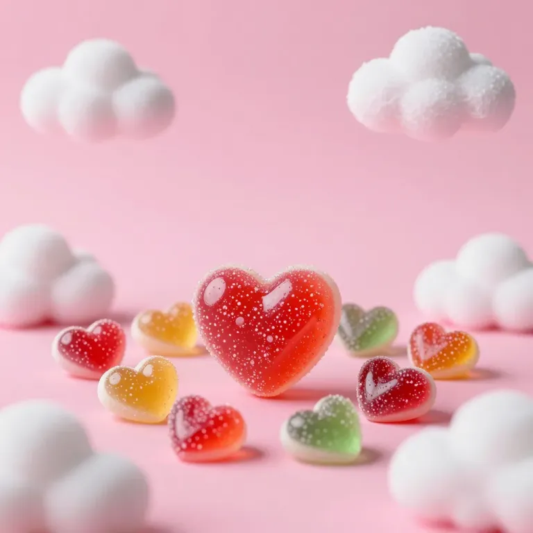 A glossy heart-shaped candy speckled with sugar crystals sits in focus, surrounded by smaller candies in a soft pink background with fluffy white clouds, creating a dreamy and whimsical setting. The diffused lighting highlights the candy's glossy surface and sugar crystals, emphasizing its texture and vibrant colors.