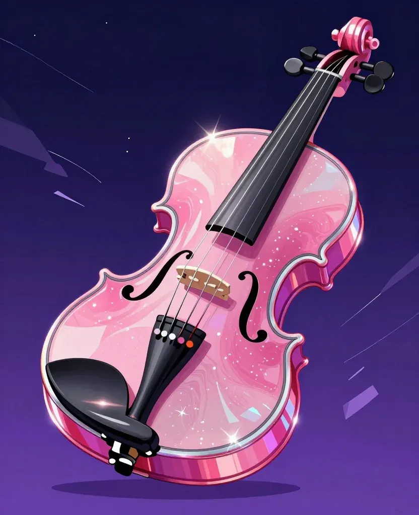 A crystal-clear pink violin with star patterns glows under soft purple ambient light, emphasizing its glossy, reflective surface and smooth texture. The starry night sky background, blurred to highlight the violin, creates a serene and ethereal atmosphere.