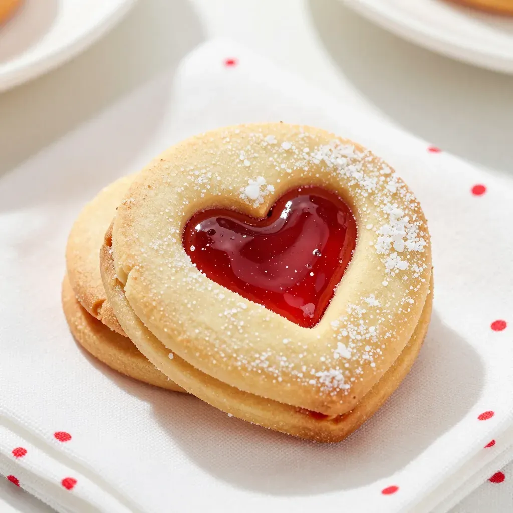 Golden brown Linzer cookies with glossy red jam filling, dusted with powdered sugar, softly lit to highlight the glossy jam and texture, set against a white napkin with red polka dots, creating a shallow depth of field that emphasizes the cookies.