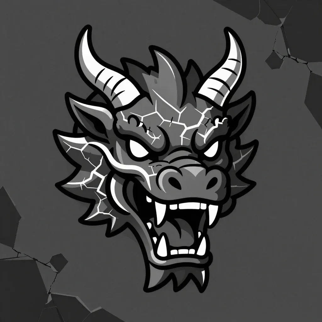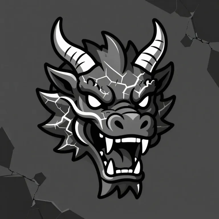 A fierce dragon's face, with rough, cracked scales and glossy inner glow, emerges from a jagged, dark gray background, creating a dramatic and intense visual. The directional lighting highlights the dragon's sharp horns and fierce expression, emphasizing its power and aggression.