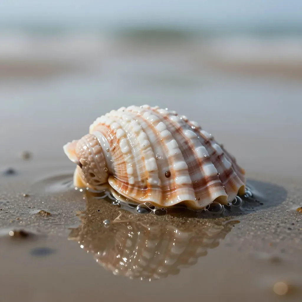 A glossy, ridged shell rests in a shallow tidepool, reflecting the warm, diffused sunlight. The soft sand and reflective water create a serene, close-up composition with a shallow depth of field, emphasizing the shell's intricate textures and earthy tones.