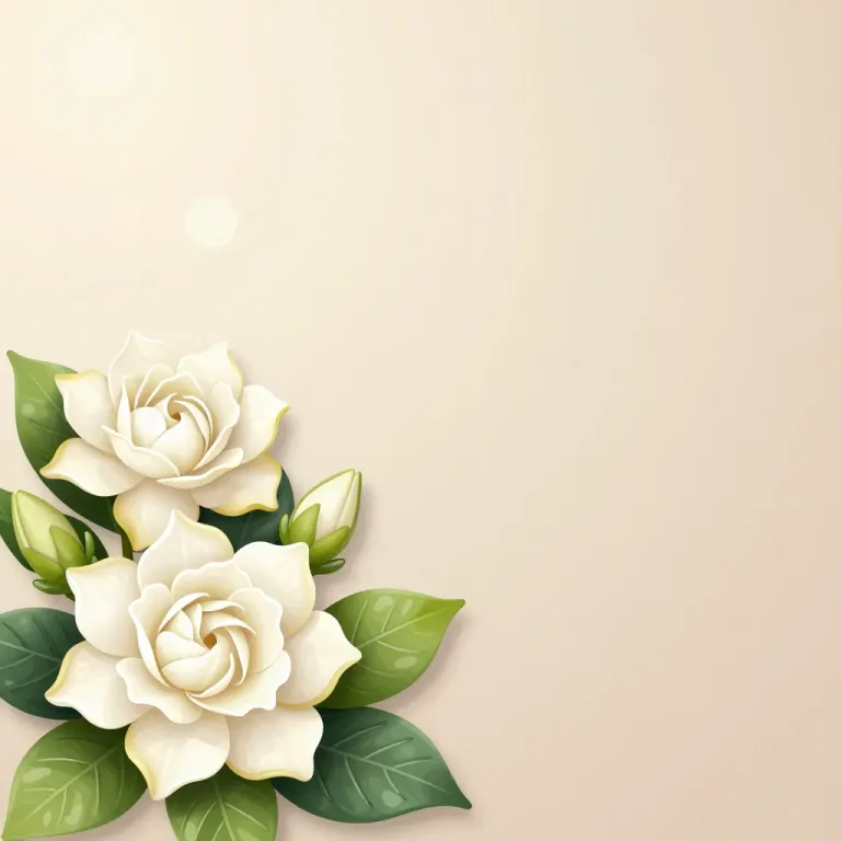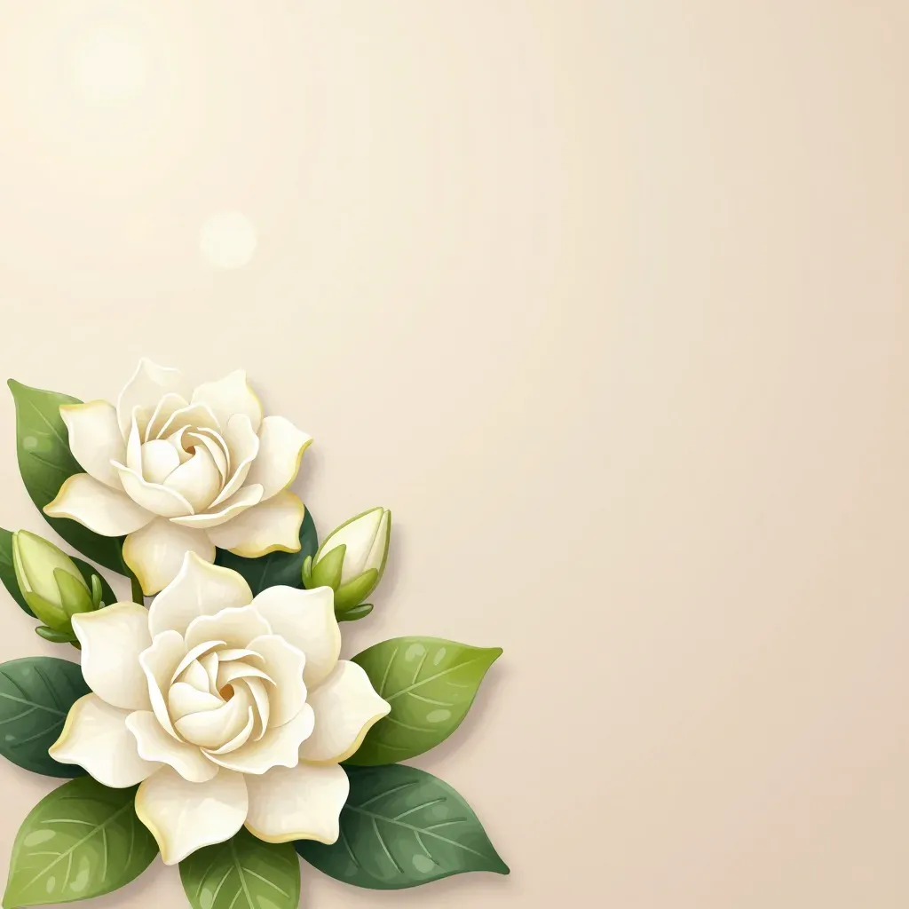 Two delicate white gardenias with velvety petals and glossy green leaves, softly lit from the top left, creating a warm, inviting atmosphere. The neutral beige background and shallow depth of field emphasize the flowers, offering ample copy space for design integration.