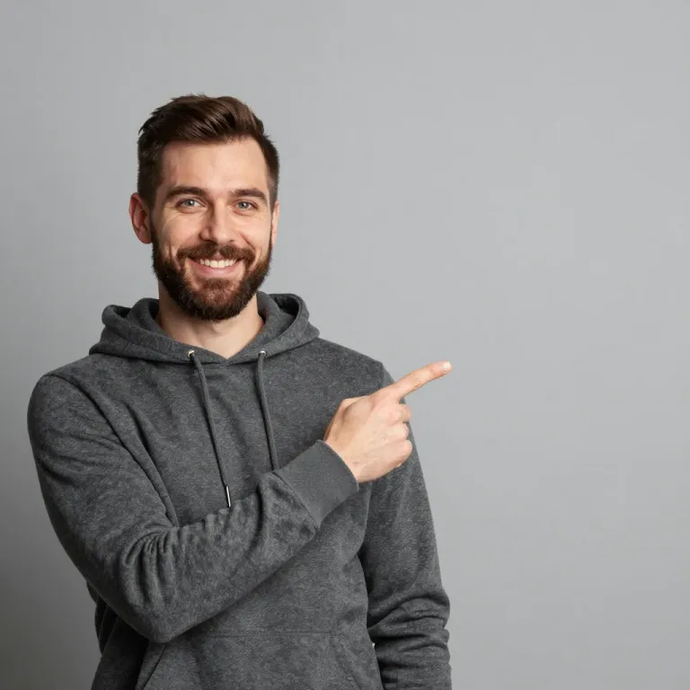A bearded man in a heathered gray hoodie smiles broadly while pointing to the right with his right hand, his skin showing natural sheen under soft front lighting. The image features a shallow depth of field with a clean, neutral gray background, providing ample copy space and focus on the subject.
