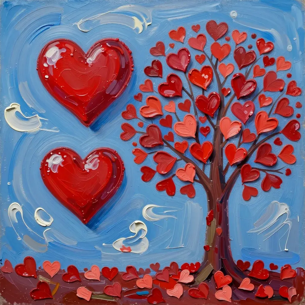 A vibrant tree with glossy red hearts as leaves stands against a soft blue sky, creating a sense of depth and movement. The bright, even lighting highlights the glossy texture of the hearts and the smoothness of the tree trunk, emphasizing the artistic quality of the image.