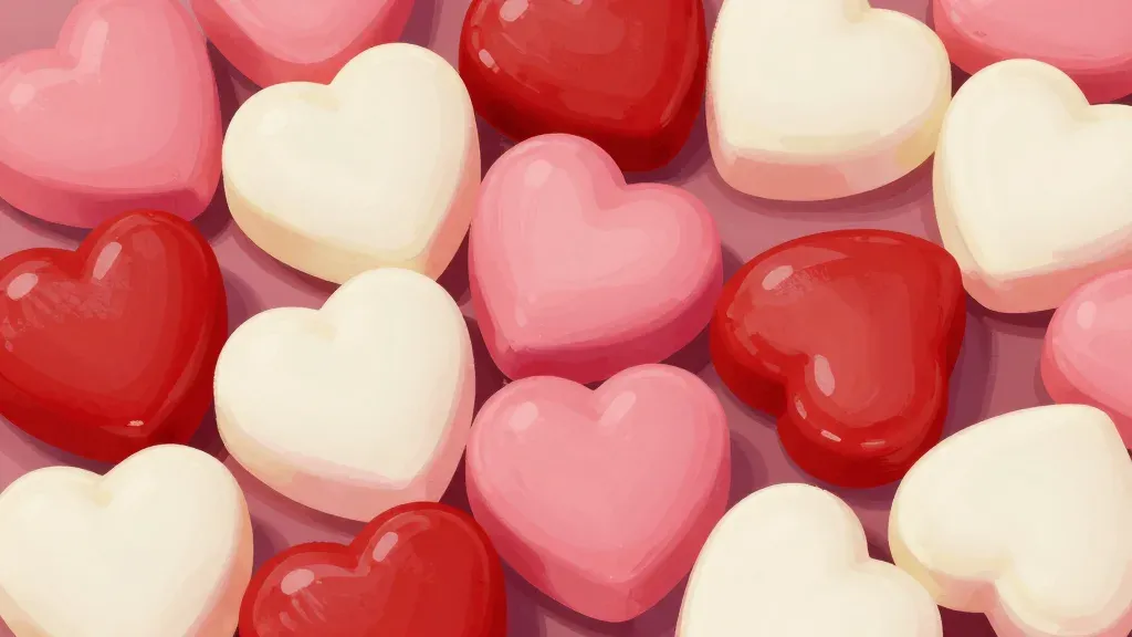 A dense pile of glossy, smooth heart-shaped candies in red, pink, and white, highlighted by diffused, soft lighting that emphasizes their glossy surfaces. The blurred, out-of-focus background draws attention to the candies, making them the focal point of the image.
