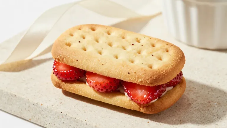 A close-up of a golden-brown biscuit sandwiched with glossy red strawberries and creamy white filling, softly lit to highlight textures and vibrant colors. The neutral, textured background draws focus to the sandwich, creating a clean and inviting composition.
