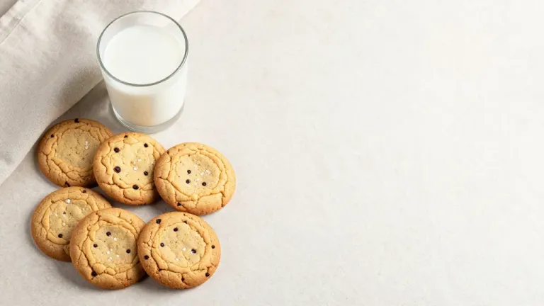A glass of milk and a cluster of chocolate chip cookies with coarse salt are arranged casually in a corner, highlighting the glossy milk and rough texture of the cookies under soft, diffused lighting. The clean, light-colored background ensures the focus remains on the main subjects, creating a sense of abundance and casualness.