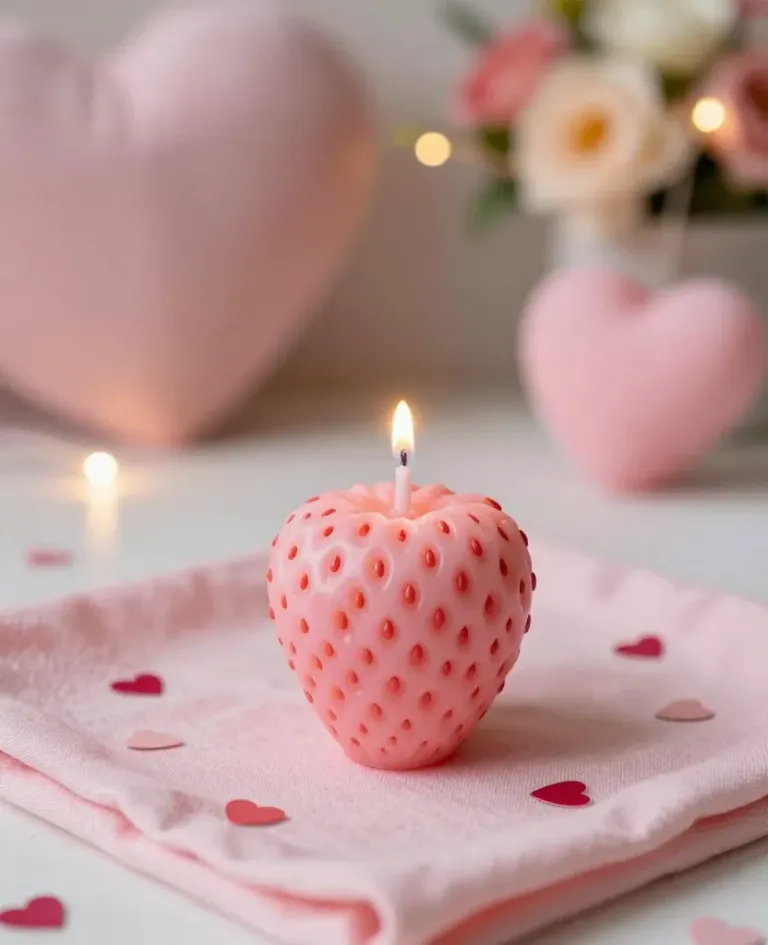 A strawberry-shaped candle with a lit wick, showcasing a soft pink wax with tiny holes, set against a warm, diffused light that creates a cozy atmosphere. The background, slightly blurred, features a heart-shaped pillow and a bouquet of roses, adding depth and context to the scene.