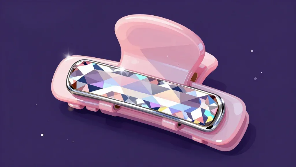 A glossy pink hair clip adorned with a sparkling gemstone, highlighted by soft, diffused lighting that accentuates its reflective surfaces and creates a subtle glow. The deep purple background ensures the focus remains on the clip's elegant design and the gemstone's sparkle.