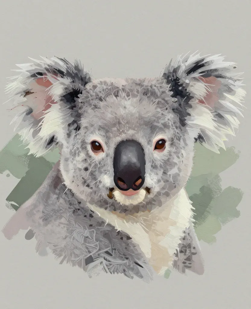 A close-up of a koala with soft, fluffy fur, facing forward with a calm expression, illuminated by diffused natural light that highlights its face and creates subtle shadows. The muted green and gray background, slightly blurred to emphasize the subject, provides a clean and uncluttered setting.