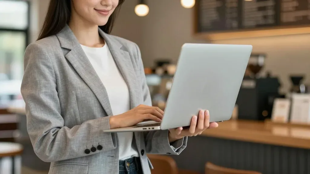 A woman in a structured grey blazer and white tee holds a silver laptop, mid-typing with a subtle smile, her hands visible on the keyboard. Soft warm ambient lighting highlights the matte laptop surface and blazer shoulders, with shallow depth of field blurring the café background to emphasize the subject.