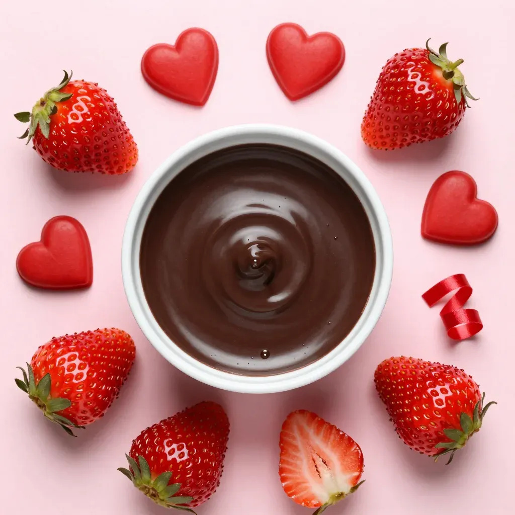 A white bowl filled with viscous, glossy dark chocolate dip is centered among fresh strawberries and red heart-shaped candies on a soft pink surface. Soft overhead lighting creates gentle highlights on the chocolate and strawberries, with a shallow depth of field emphasizing the central composition and clean, minimalist background.