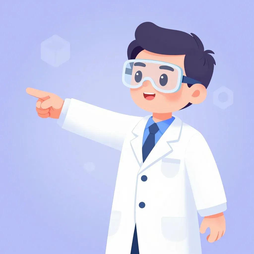 A young scientist in a lab coat and safety goggles points to the left, illuminated by soft, diffused light that highlights the subject against a subtly blurred lavender background with hexagonal patterns.