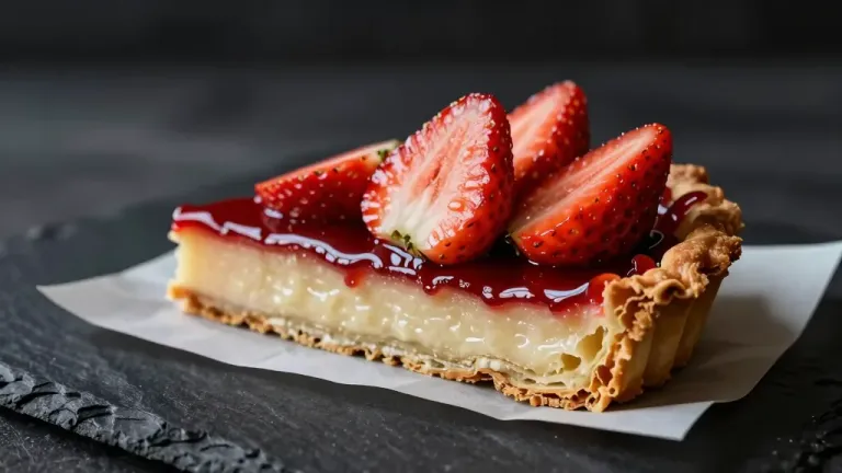 A close-up of a golden flaky tart slice topped with glossy glaze and juicy strawberries, set against a dark slate background that enhances the vibrant colors and textures. The shallow depth of field draws attention to the intricate details of the tart, making it perfect for culinary and food photography.