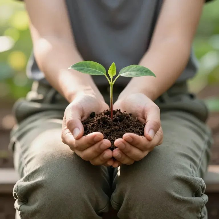 A pair of hands gently cradle a small plant with dark, earthy soil, its glossy green leaves glowing under soft morning light. The blurred background of greenery suggests an outdoor garden setting, creating a warm and nurturing atmosphere.