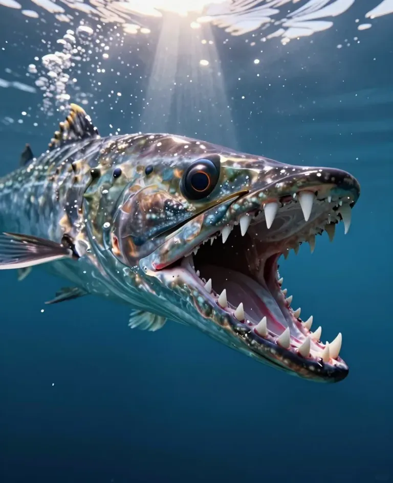 A barracuda lunges forward in a dynamic side profile, its mouth wide open revealing sharp translucent teeth and glossy iridescent scales catching sunbeams from above. The low-angle diagonal composition with shallow depth of field isolates the subject against a clean gradient of deep blue water and sunlit surface ripples.
