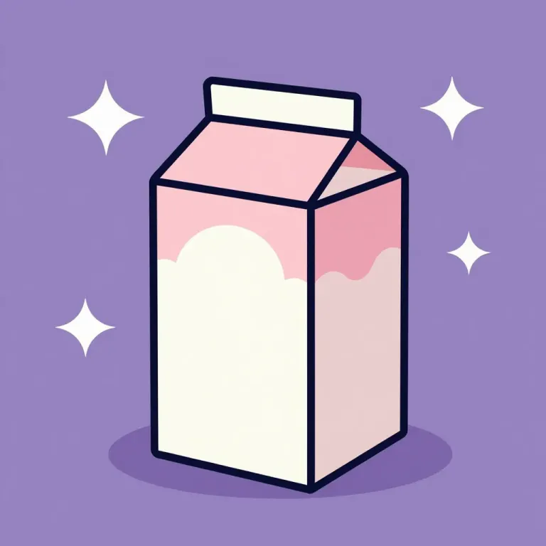 A glossy pink milk carton with a creamy interior, softly lit and slightly tilted, creating a whimsical, dreamy atmosphere against a purple background with sparkling stars. The dynamic composition and soft lighting make this image perfect for a variety of creative projects, from food and beverage ads to dreamy, playful designs.