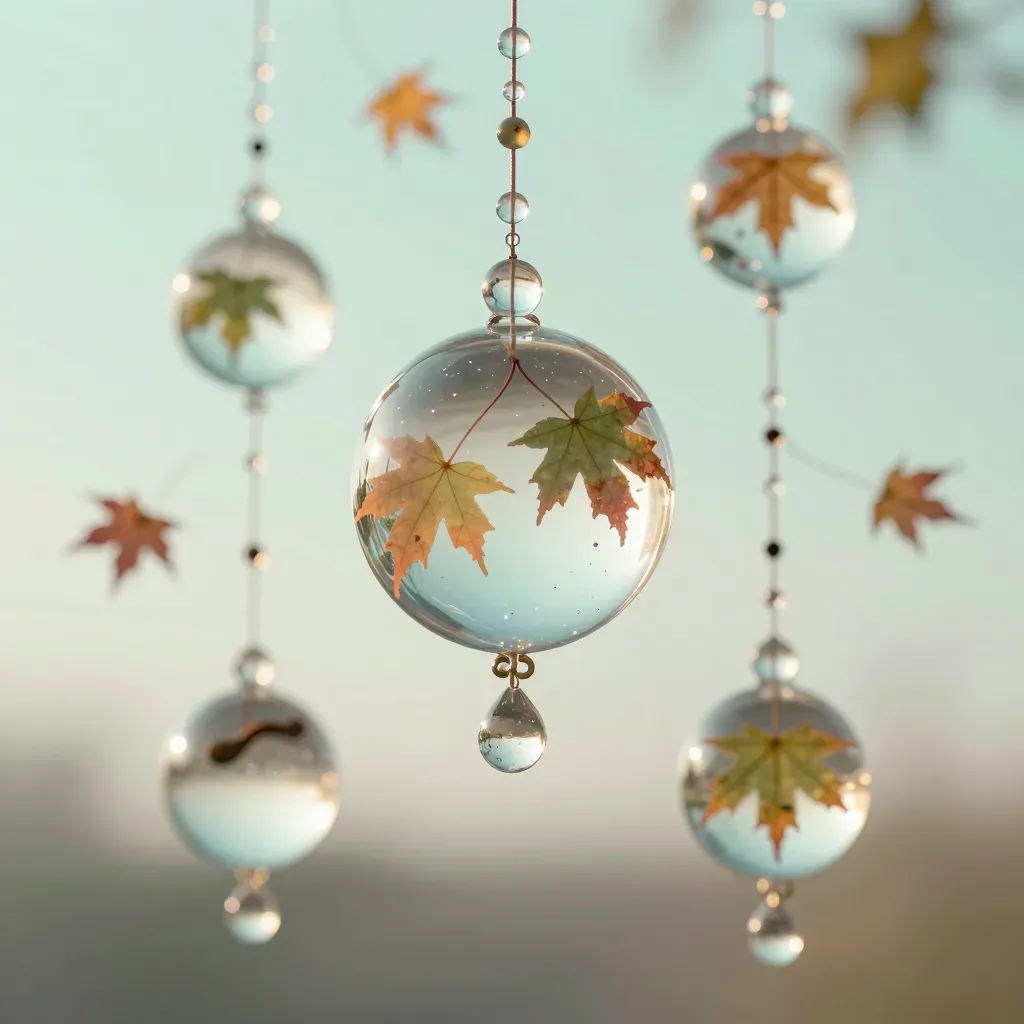 Transparent glass orbs containing glossy autumn leaves with dew droplets, softly illuminated by diffused light, creating a dreamy, ethereal atmosphere. The balanced arrangement and soft lighting make this image ideal for use in interior design or as a decorative element in digital compositions.