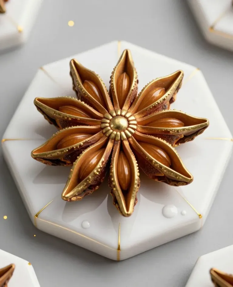 A glossy, star-shaped confection with layered petals, highlighted by soft, diffused lighting that accentuates its velvety texture and golden hue. The clean, white hexagonal plate background provides a stark contrast, emphasizing the confection's intricate details and luxurious appearance.