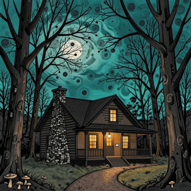 A cozy cabin with a stone chimney and wooden porch is illuminated by lanterns, casting a warm glow against a swirling teal night sky. The dense forest and path leading to the cabin create a sense of depth and tranquility.